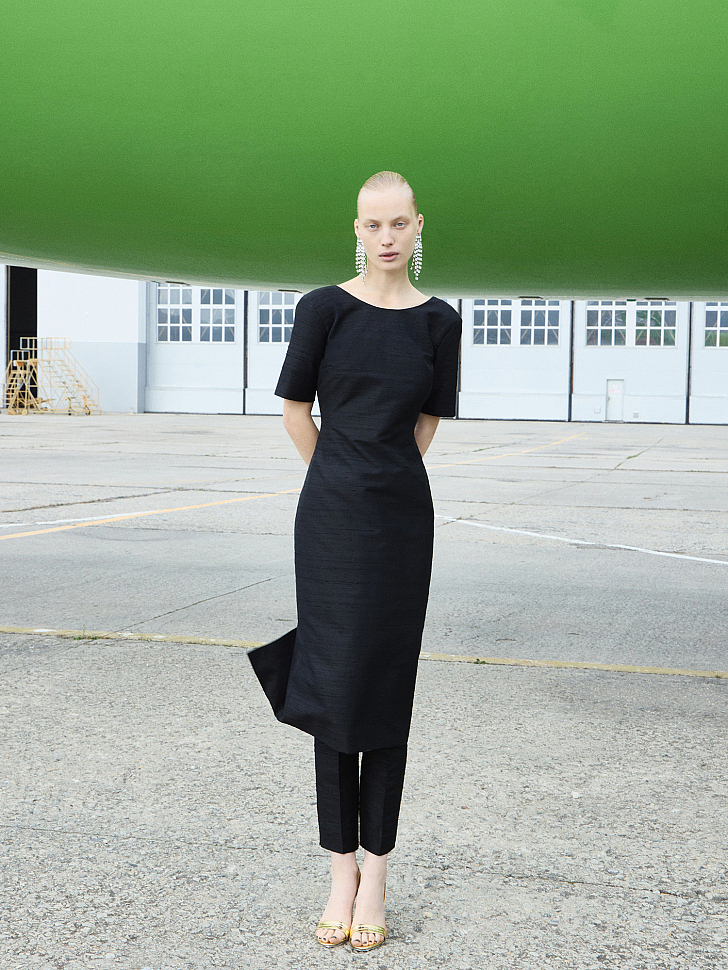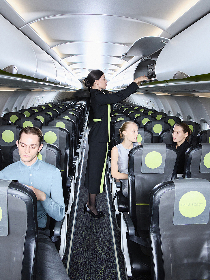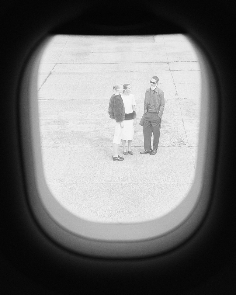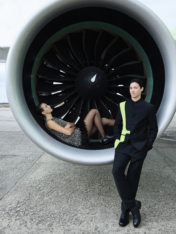 For the cover story "Sky, Airplane, Girl," the Moskvichka team traveled to Mineralnye Vody Airport. The location was no coincidence: it is one of the few cities where S7 has a maintenance base. The conceptual looks, along with the airline's new flight attendant uniforms, were photographed right on the airfield—under the wing and near the powerful turbines of a plane that was at Moskvichka's disposal for the entire day.