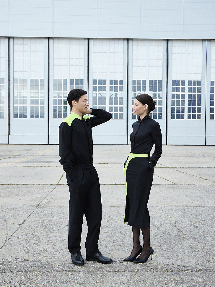 In the frame are those who spend most of their lives at high altitudes: flight attendants Eduard Erofeev and Irina Semyonova. For Eduard, this shoot was not his debut: in September, he participated in a uniform fashion show in Sochi as part of the Refashion Campus. Trendy seasonal coats, fur coats, and dresses paired with jackets were modeled by Alina Miller, Slava Sikorsky, and Yulia Bulakhtina.